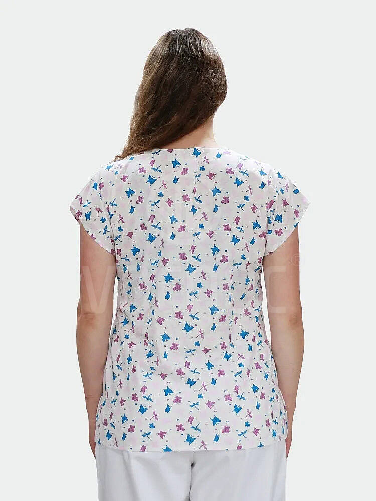 Zdravotnická dámská halena se vzorem motýlů se spadenými rukávy, tvarovaný výstřih, 2 kapsy spodní a 1 kapsa náprsní. Halena je ušitá z balvněného plátna. Svým vzorem vykouzlí úsměv na tvářích nejen dětských pacientů.