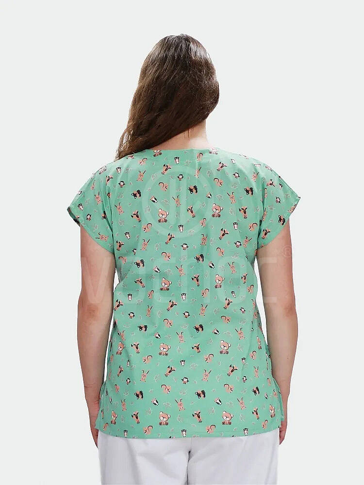 Zdravotnická dámská halena se vzorem zvířátek se spadenými rukávy, tvarovaný výstřih, 2 kapsy spodní a 1 kapsa náprsní. Halena je ušitá z balvněného plátna. Svým vzorem vykouzlí úsměv na tvářích nejen dětských pacientů.