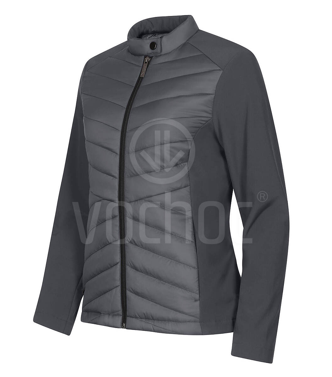 Dámská hybridní bunda CROSS. Kombinace prošívaného a softshellového materiálu. Střih tvarovaný bočními díly, celopropínací spirálový zip, boční kapsy se spirálovým zipem, vnitřní náprsní kapsa na  zip, stojáček na druk. Vstup pro branding v podšívce zadního dílu.