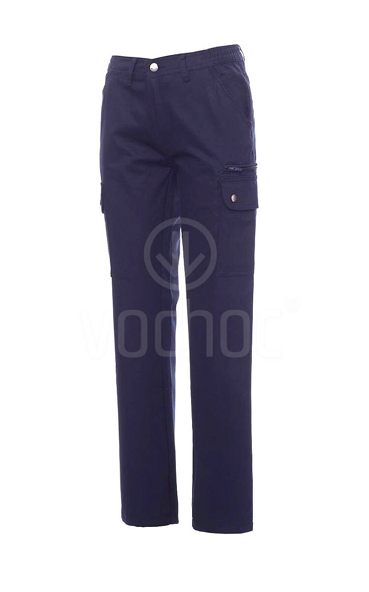 Dámské kalhoty klasického střihu, celoroční, elastické pásky na bocích a poutka v pase, zapínání na zip a na kovový knoflík, dvě přední kapsy klasicého střihu, dvě postranní kapsy s klopou a druky, jedna kapsa na zip po levé straně, skrytá kapsa na svinovací metr po pravé straně, dvě zadní prostřižené kapsy s knoflíkovou dírkou a knoflíkem.