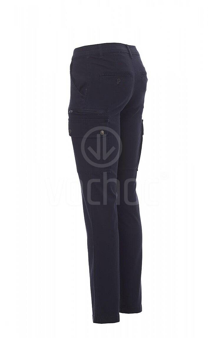 Dámské kalhoty klasického střihu, streč, celoroční, elastické pásky na bocích a poutka v pase, zapínání na zip a na kovový knoflík, dvě přední kapsy klasicého střihu, dvě postranní kapsy s klopou a druky, jedna kapsa na zip po levé straně, skrytá kapsa na svinovací metr po pravé straně, dvě zadní prostřižené kapsy s knoflíkovou dírkou a knoflíkem.