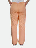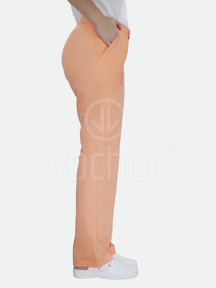Dámské meruňkové lékařské kalhoty Mirka se sníženým pasem, které jsou vhodné i do potravinářství, zdravotnictví apod. Dvě přední klínové kapsy, zapínání na knoflík a zip. Zadní část pasu je do gumy.