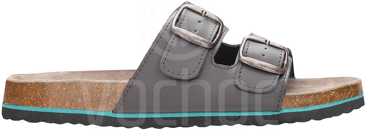 Korkové pantofle s hnědými koženými pásky a kovovými sponami