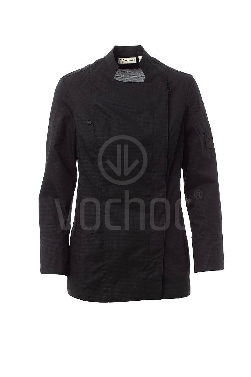 Dámský kuchařský rondon se stojáčkem je vyroben z odolného bavlněného ripstopu s příměsí Lycry® T400®, která zajišťuje výjimečnou elasticitu, tvarovou stálost a vysokou prodyšnost. Pohodlí při celodenním nošení podporují prodyšné síťované panely na zádech a v podpaží, které efektivně odvádějí teplo a zvyšují cirkulaci vzduchu.