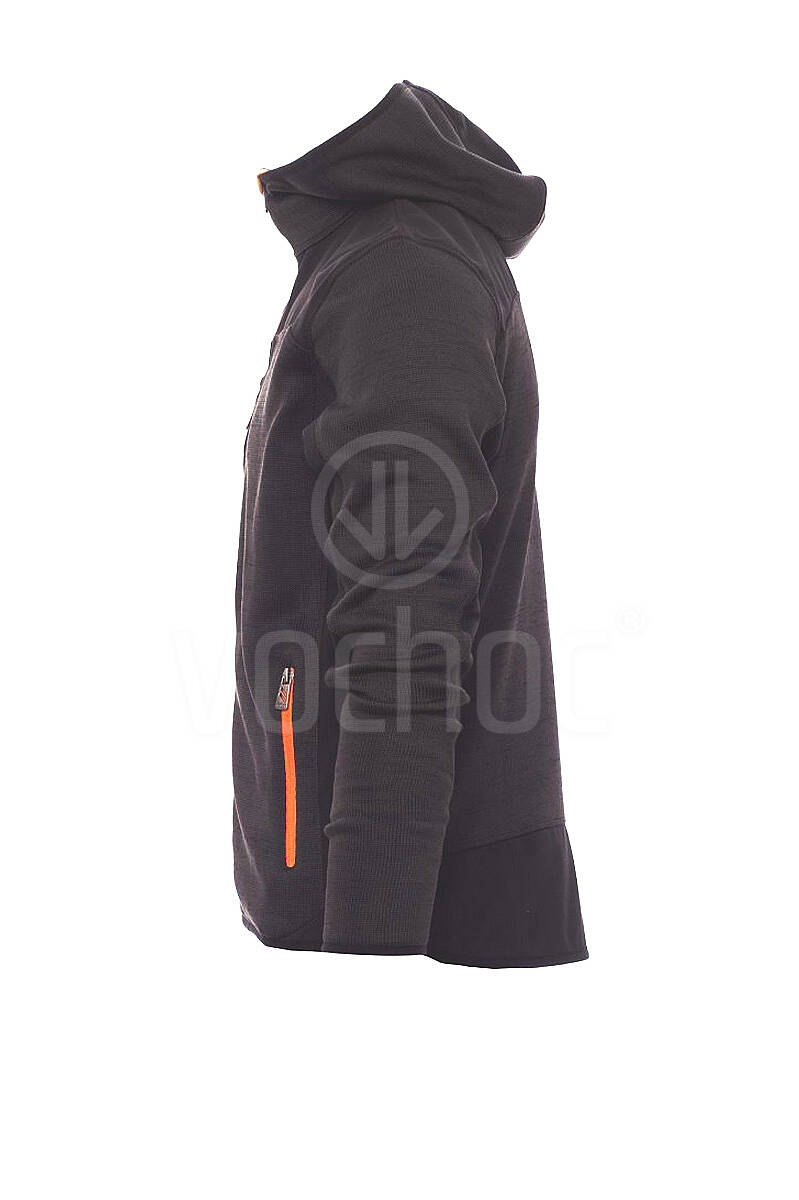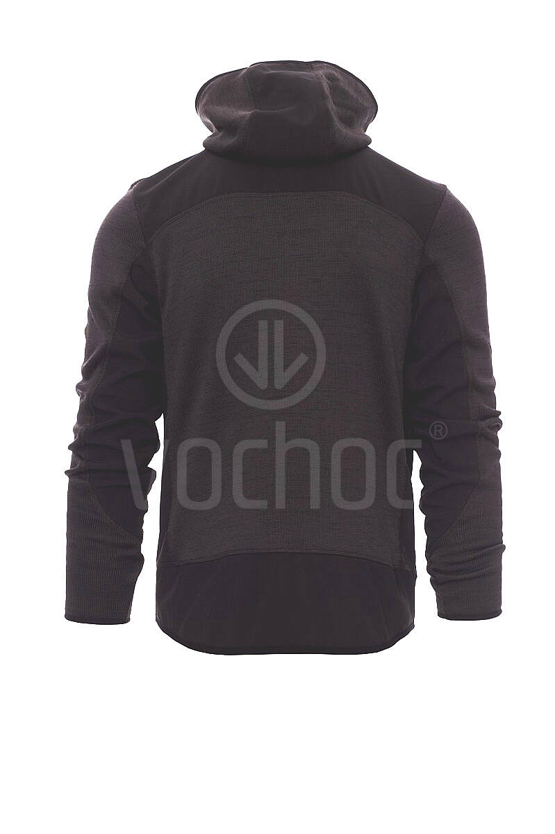 Pánská softshellová mikina, utěsněný celozip SBS, tvarovaná kapuce s dvojitým prošitím, tenký lem na zápěstí a v pase, dvě postranní kapsy na zip, jedna kapsa na hrudi. Úplet s vsadkami z černého softshellu.