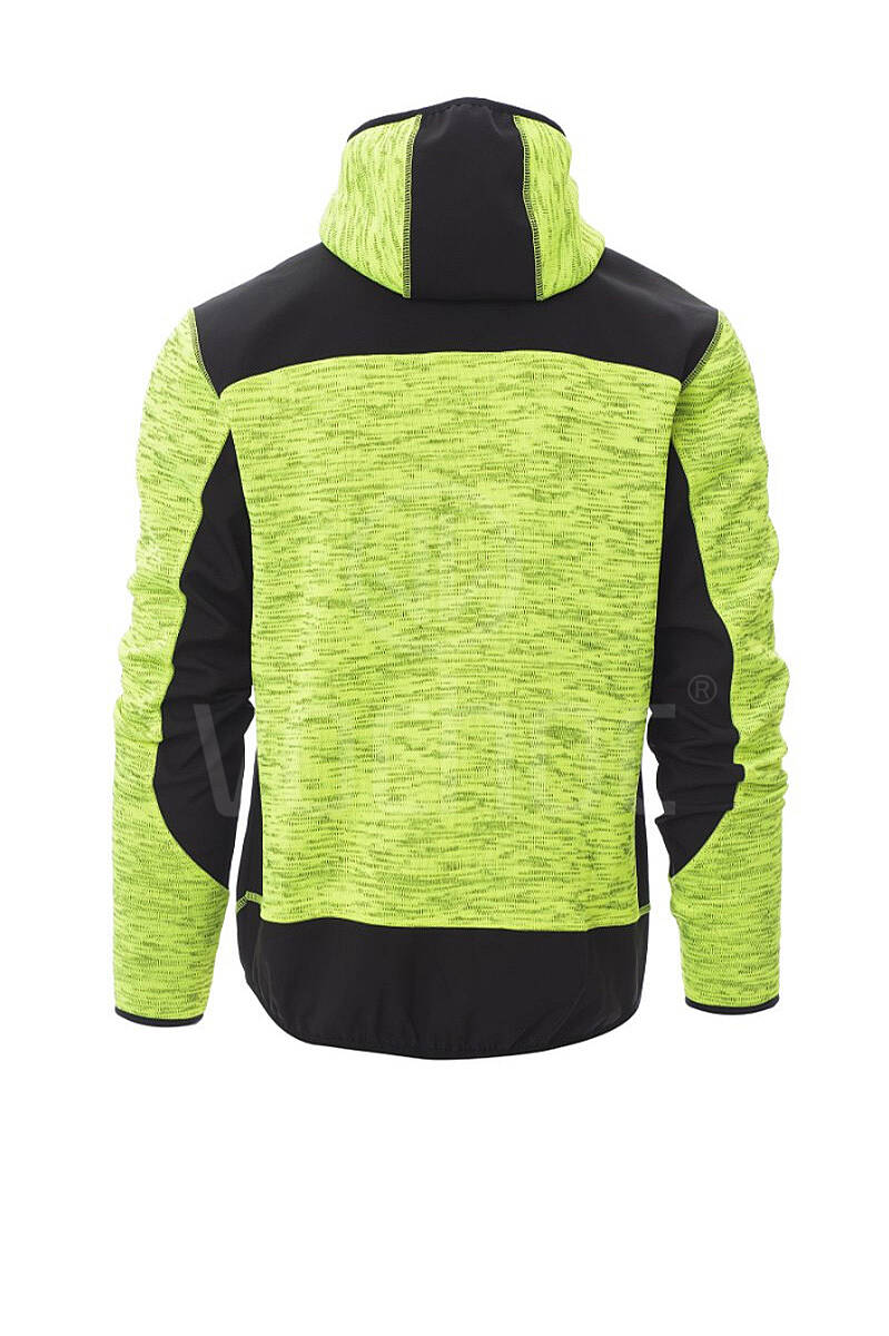 Pánská softshellová mikina, utěsněný celozip SBS, tvarovaná kapuce s dvojitým prošitím, tenký lem na zápěstí a v pase, dvě postranní kapsy na zip, jedna kapsa na hrudi. Úplet s vsadkami z černého softshellu.