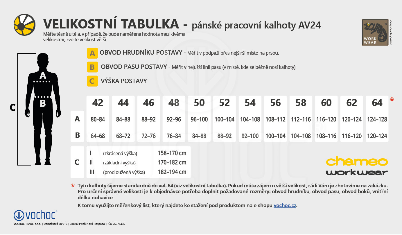 Tyto kalhoty vyrábíme v ČR a šijeme je standardně do vel.64 (viz velikostní tabulka). Pokud byste potřebovali větší velikost, rádi Vám je také vyhotovíme, ale prosíme pro určení správné velikosti zaslání Vašich následujících rozměrů: obvod boků, pasu, hrudníku, výšku postavy. Kalhoty ušité namíru nelze měnit ani vracet - jedná se o zakázkovou výrobu.