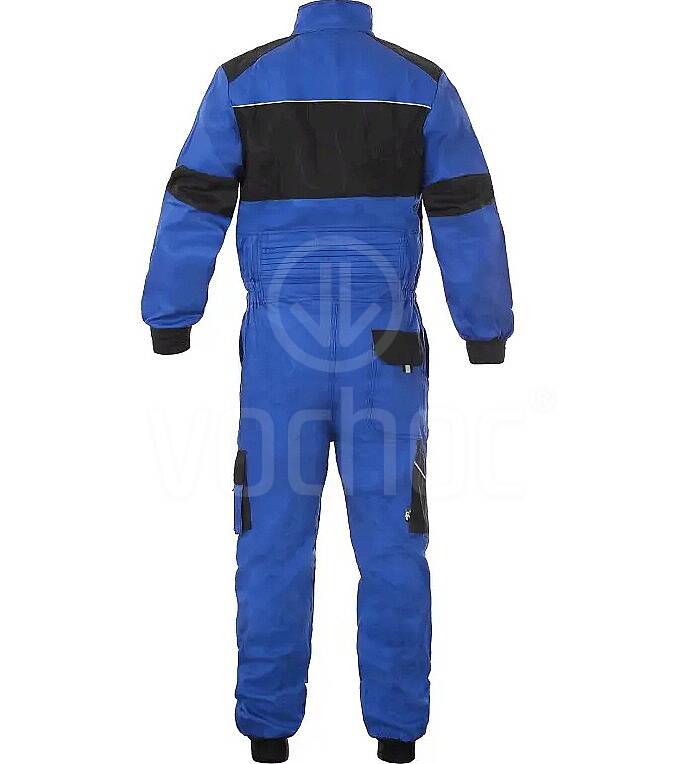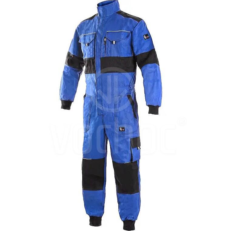 Pracovní kombinéza zateplená dutým vláknem. Kombinace modré a černé – černé sedlo na hrudi prošité modrou nití. Dvě kapsy na hrudi na suchý zip, dvě šikmé kapsy, oboustranný zip a stojáček na suchý zip. V pase stažení do gumy a  pásek na suchý zip.