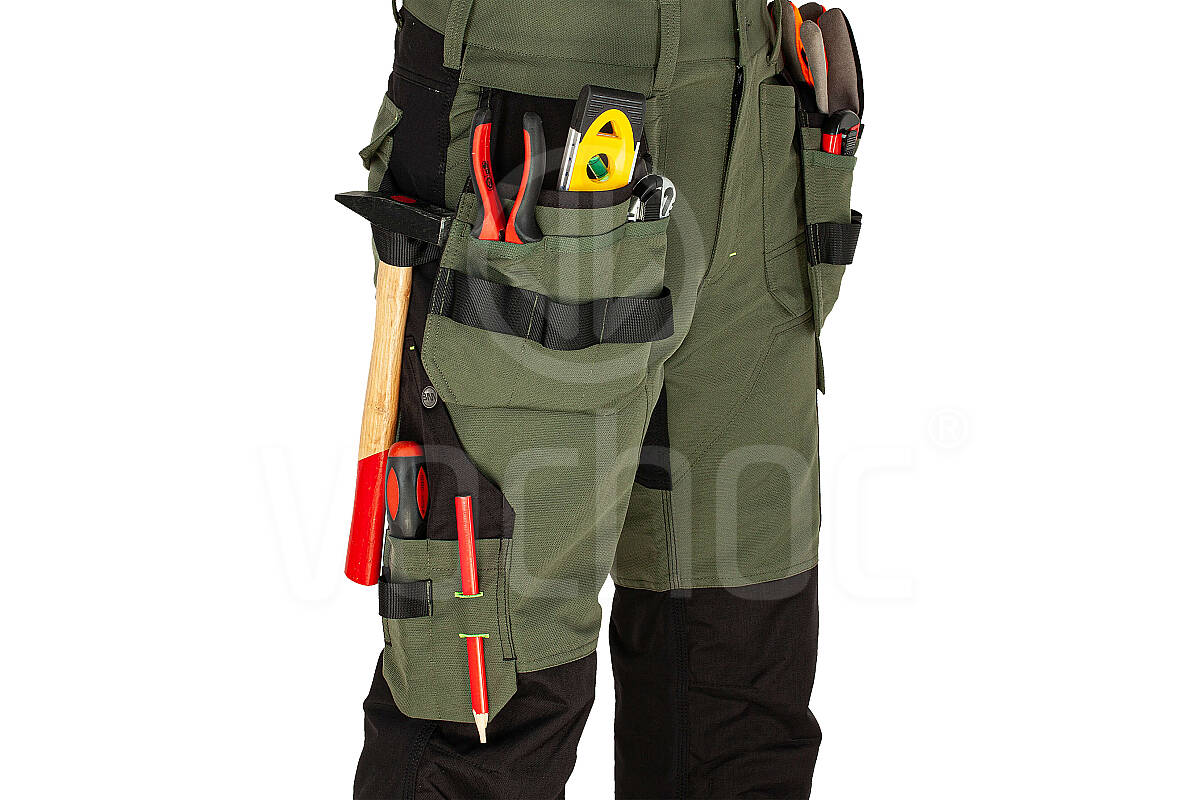 Kalhoty přo řemeslníky EREBOS jsou vyrobeny z velmi pevného a stálobarevného materiálu s partiemi z pružného materiálu s přídavkem Spandexu. Kalhoty mají opravdu velké množství kapes, horní opaskové kapsy se dají odepnout pomocí zipu v případě, že je momentálně nepotřebujete. Kolenní části jsou vyztuženy materiálem Cordura®, který je vysoce mechanicky odolný proti prošoupání. Řemeslnické kalhoty jsou pro zvýšení Vaší bezpečnosti vybaveny decentními reflexními prvky v dolní oblasti nohavic.